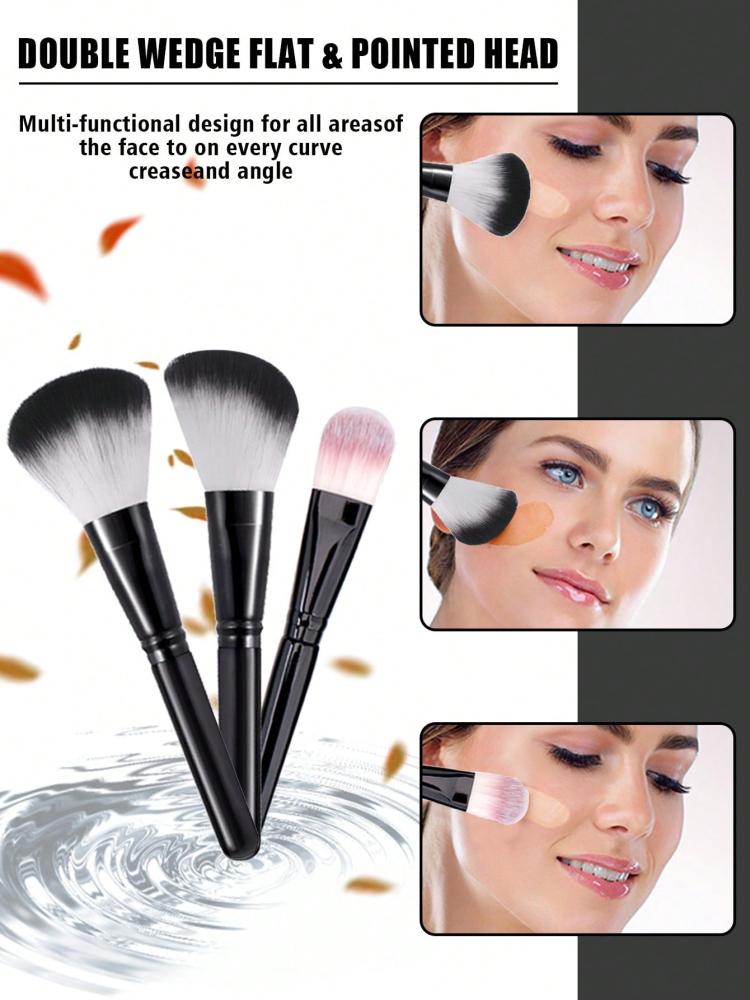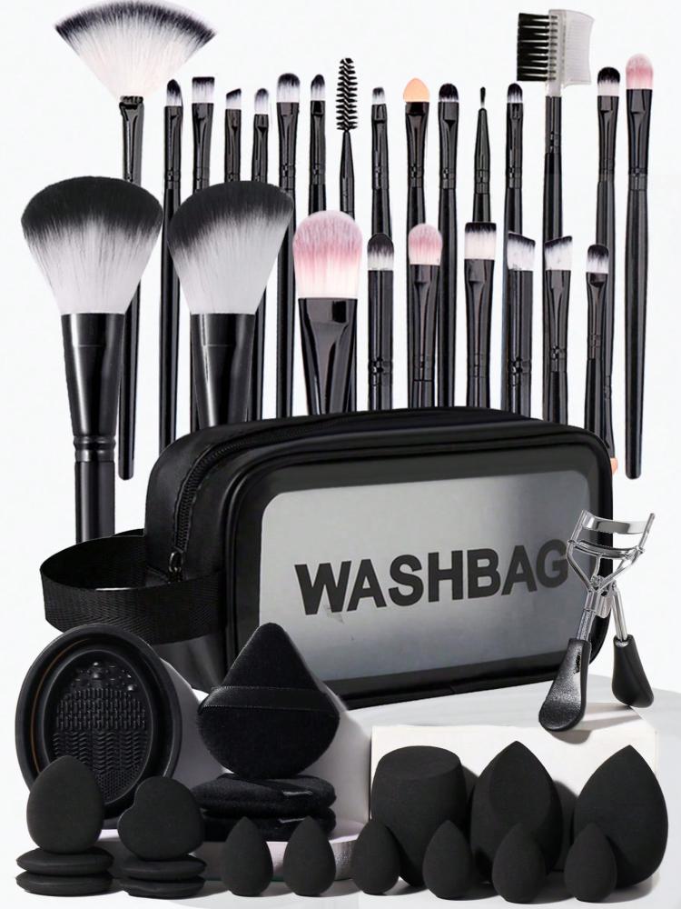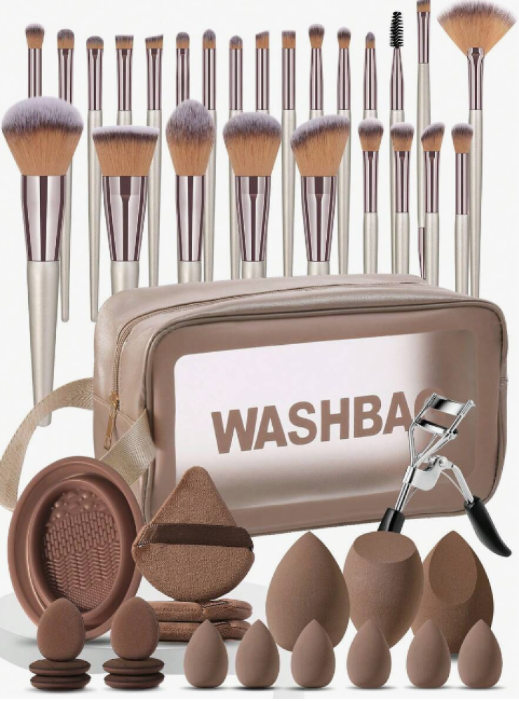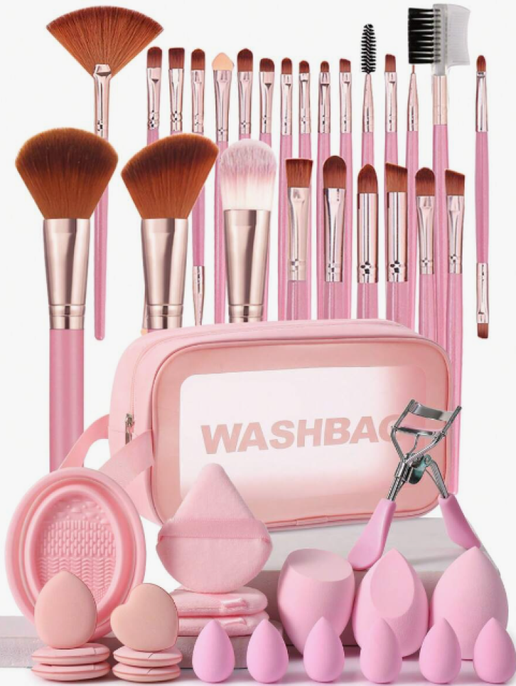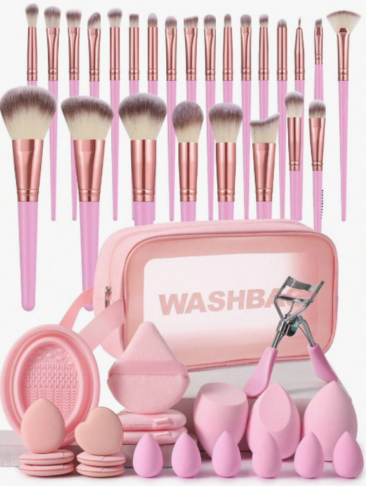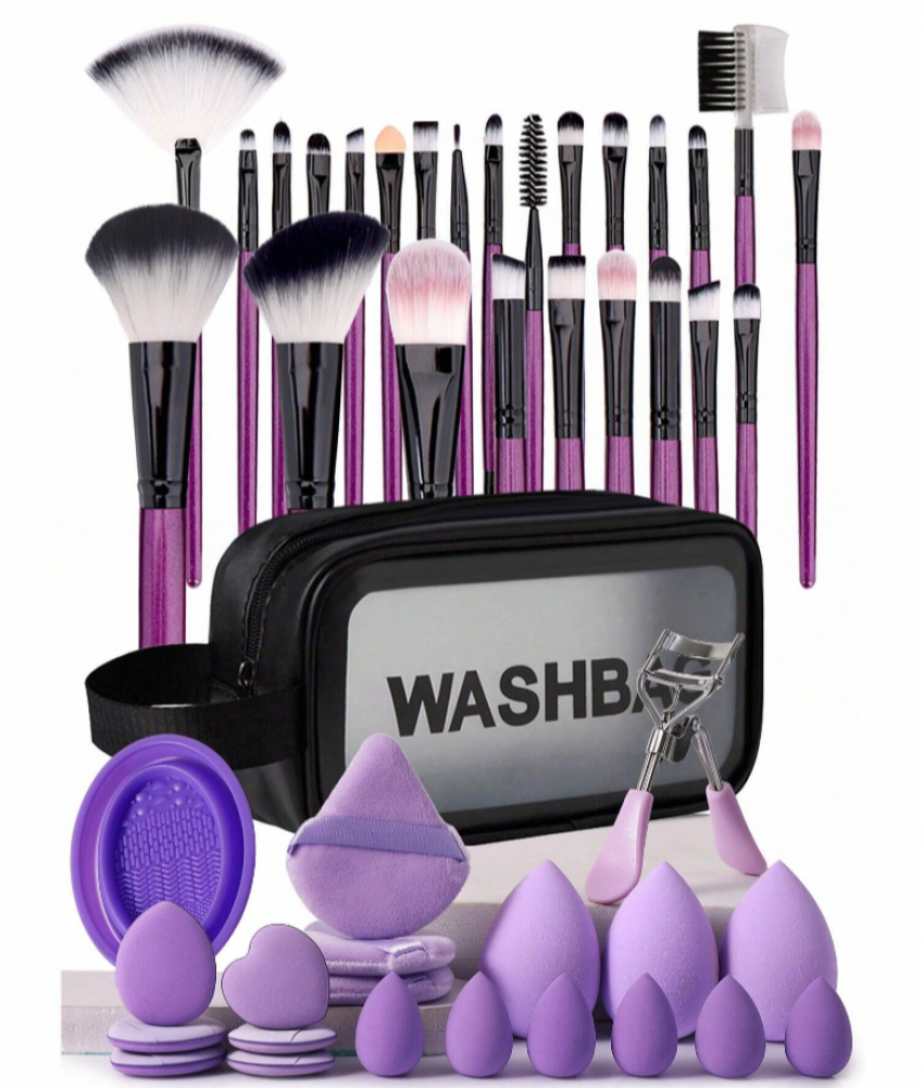 مجموعة 46 قطعة أدوات مكياج احترافية للمبتدئات، تشمل 25 فرشاة مكياج (فرشاة أساس، فرشاة بودرة، فرشاة أحمر الخدود، فرشاة تنوير، مجموعة فرش ظلال العيون، فرشاة رموش، فرشاة ايلاينر، فرشاة تشكيل، فرشاة تفاصيل) + 3 إسفنجات مكياج للمكياج السائل والخلط + 3 كرات بود